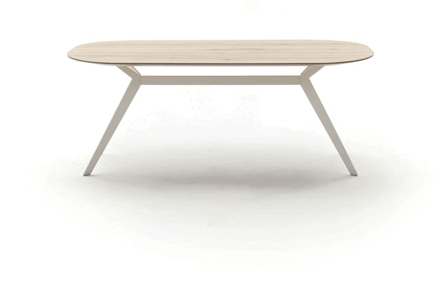 01. Tisch Contur® 3100, ovale Tischplatte in massiver astiger Eiche mit Schweizer Kante, weiss geölt, filigranes Design Gestell weiß lackiert, BHT 200x100, 76 cm hoch, 3.190,-